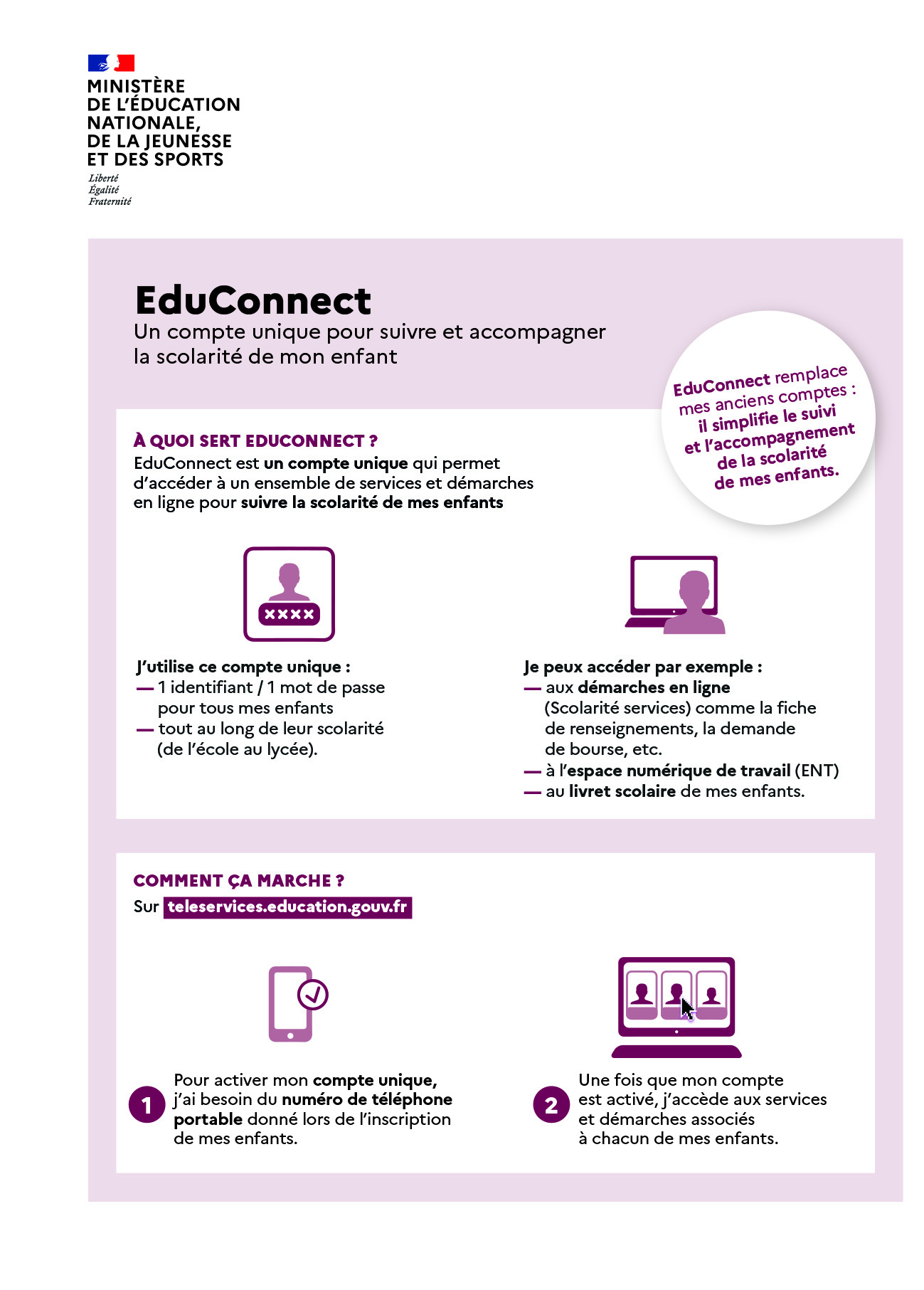 Pour remplir les différentes phases de cette procédure, les parents doivent se connecter à leur compte Educonnect. C’est un compte qui vous permet de suivre la scolarité de vos enfants. (lien vers l’infographie)