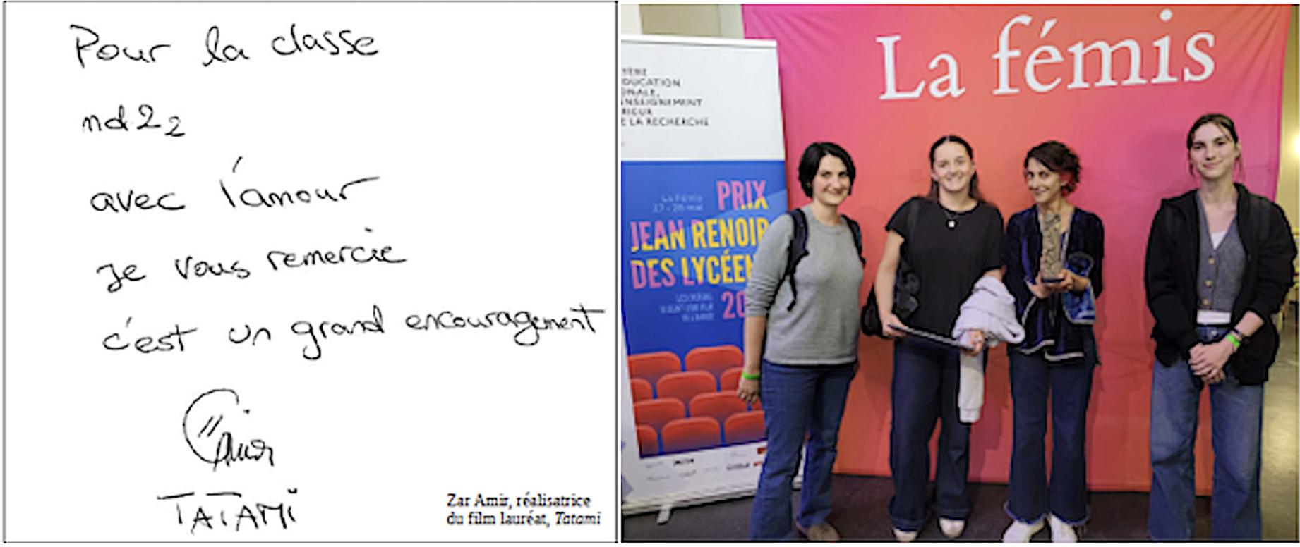 Du 27 au 28 mai, deux élèves représentant notre classe ont eu la chance d’aller à Paris découvrir la prestigieuse école de cinéma La Fémis afin de rencontrer et échanger avec les réalisateurs, producteurs et/ou distributeurs de chaque film. Elles ont également pu débattre sur chaque film avec des élèves de la France entière afin d’en garder un seul, celui qui recevra le prix.
