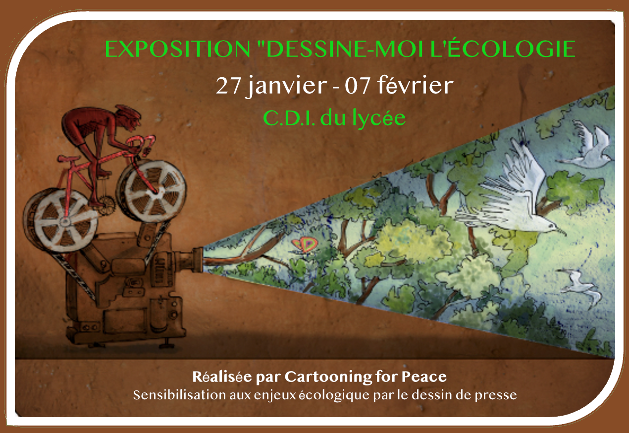 Du 27 janvier au 7 février, le CDI de notre lycée accueille l’exposition itinérante « Dessine-moi l’écologie », gracieusement prêtée par la section MGEN du Lot-et-Garonne.