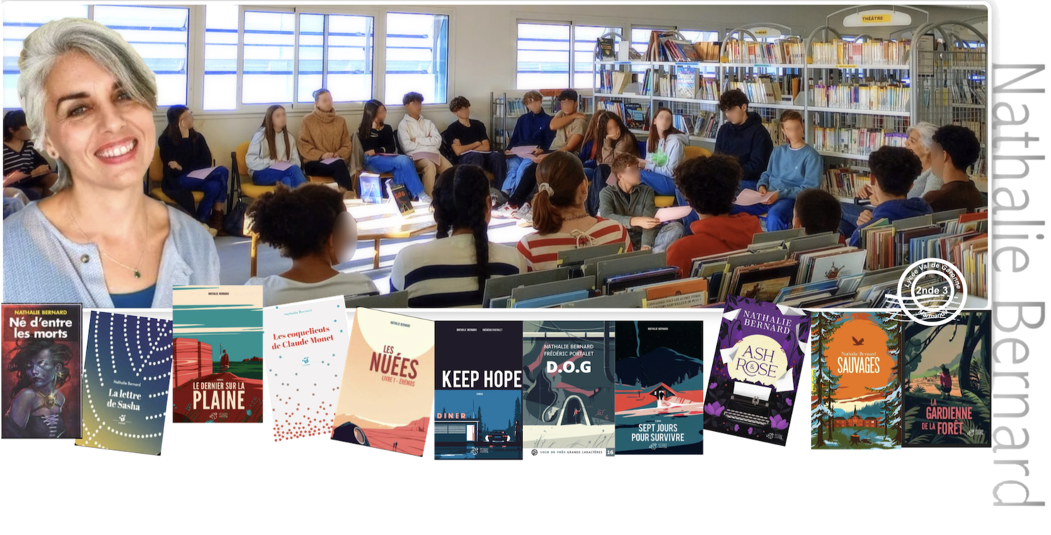 Vendredi 15 novembre 2024, dans le cadre du projet « De l’idée au livre » *, l’écrivaine Nathalie Bernard est venue au CDI rencontrer notre classe de 2nde3. Cette visite avait pour but de nous faire découvrir son univers, son métier et son parcours d’autrice.